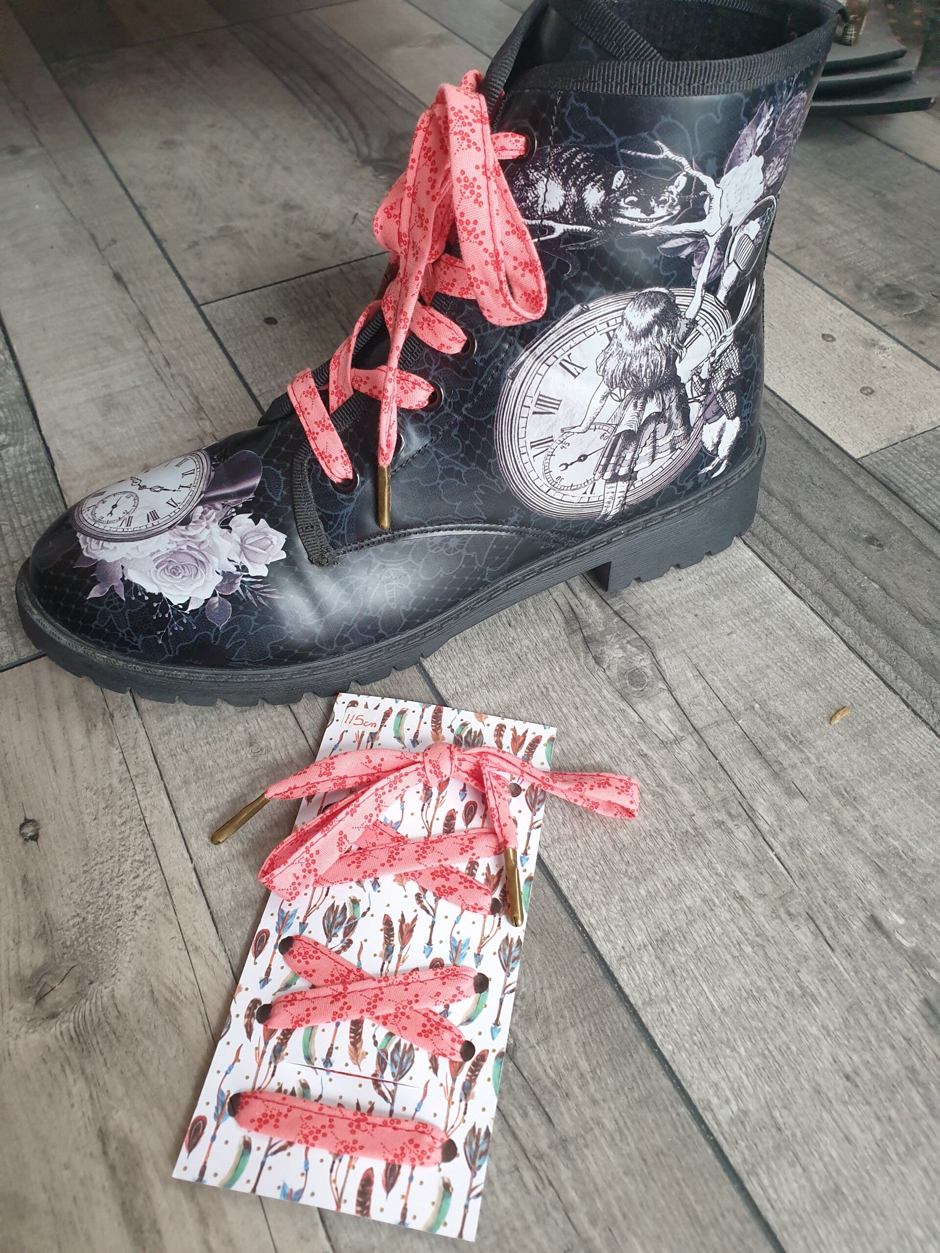 Les lacets sont finis par 2 embouts métalliques et le lacet est cousu sur toute la longueur .