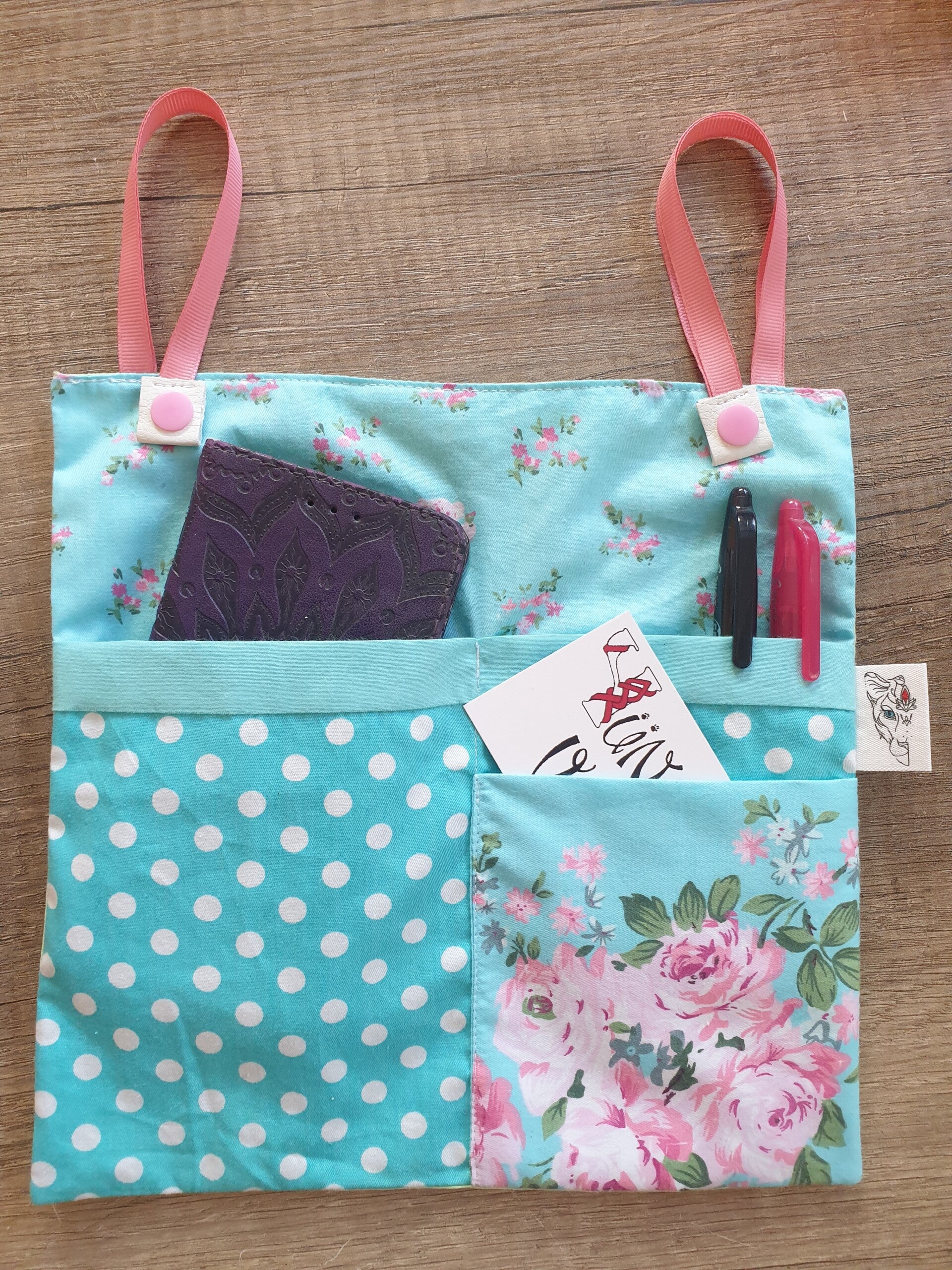 Organiseur de sac, petit plus très pratique, qui s'accroche dans tous vos sacs grâce à ses deux petites attaches prévues pour venir s'enrouler autour des poignées, fixées par des petites pressions, afin de vous offrir des poches supplémentaires.